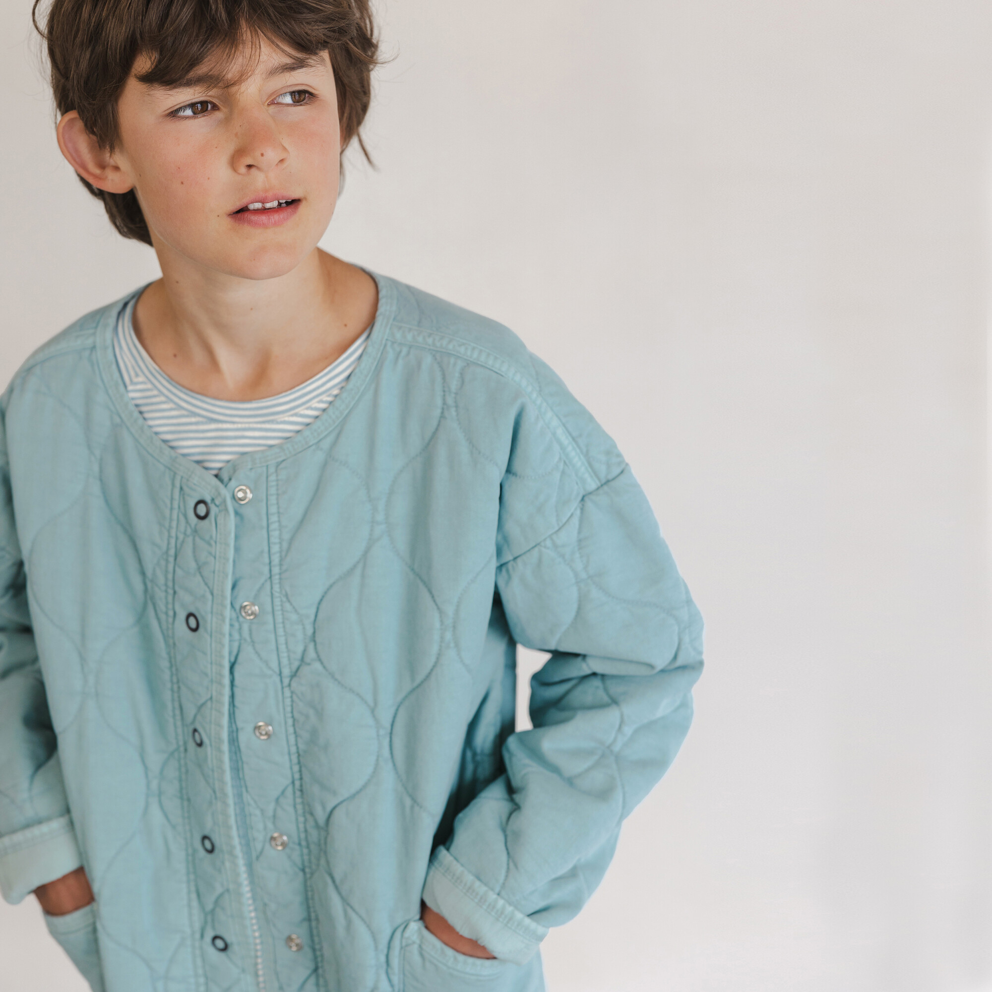 Zachte gewatteerde en gevoerde jas, gemaakt van een twillstof van biologisch katoen met lyocell. Sluit met drukknoopjes en is voorzien van zakken aan de voorkant. De jas heeft een elastische onderzoom voor een bomberpasvorm.