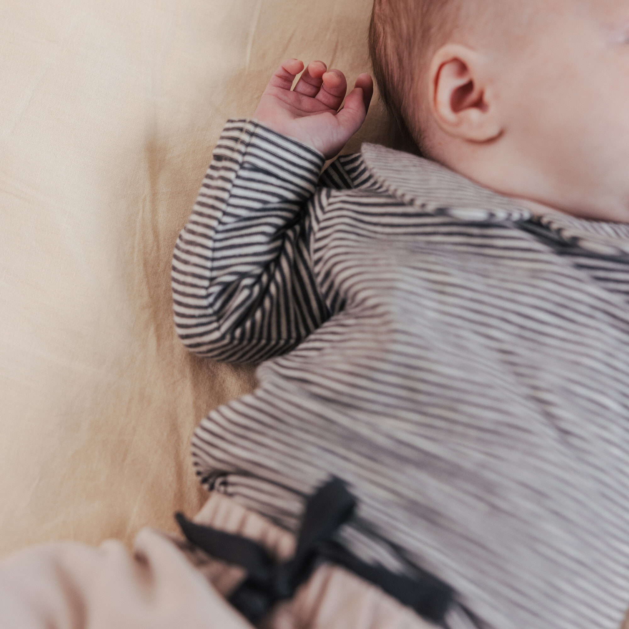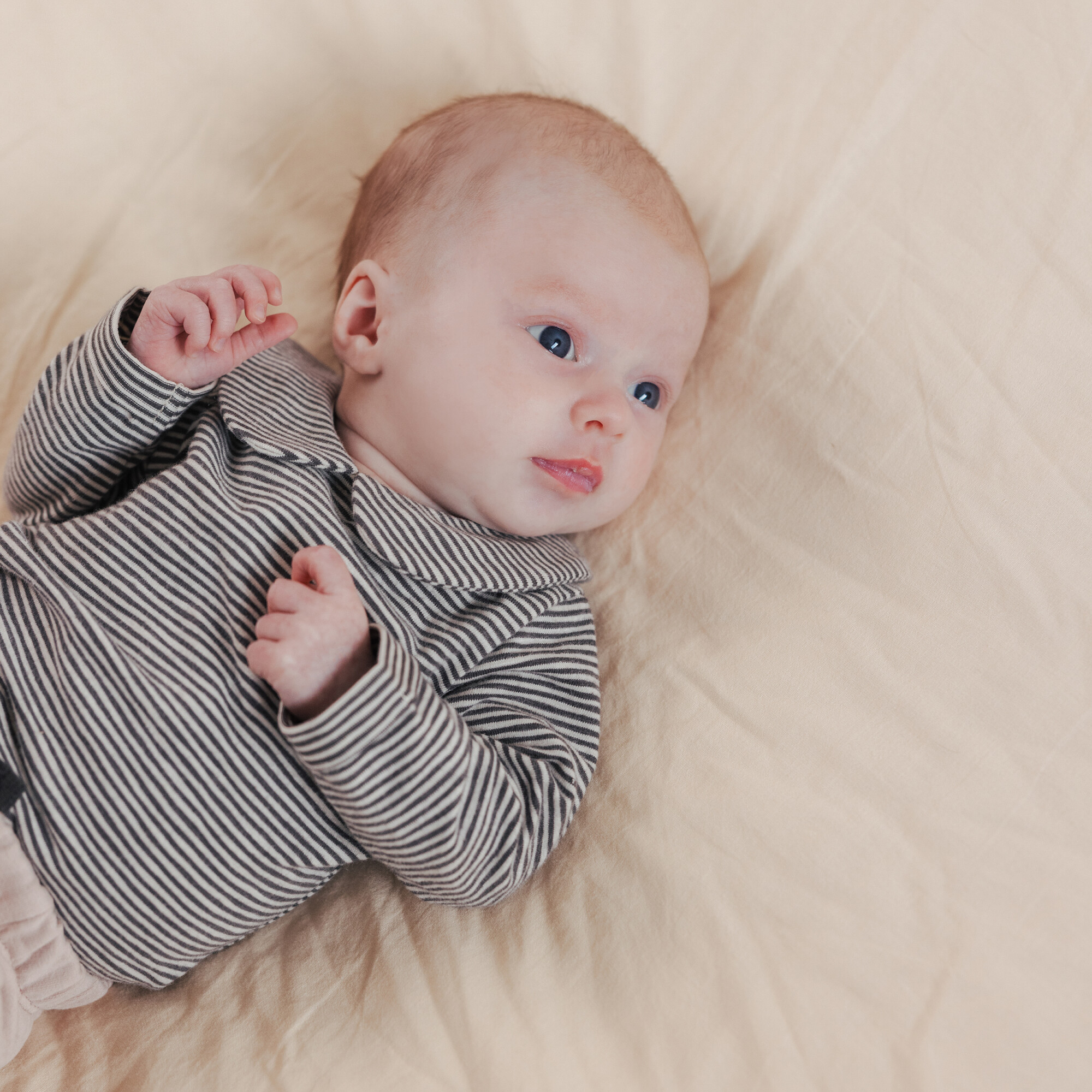 Een klassieke en verfijnde basic: dit gestreepte baby topje met een clean-finish (niet doorgestikt) kraagje. Omslagjes aan de mouwtjes en een flatlock afwerking aan de zoom. Onze collar tee is onderdeel van onze vaste Essentials collectie. Makkelijk te combineren met babybroekje of legging.