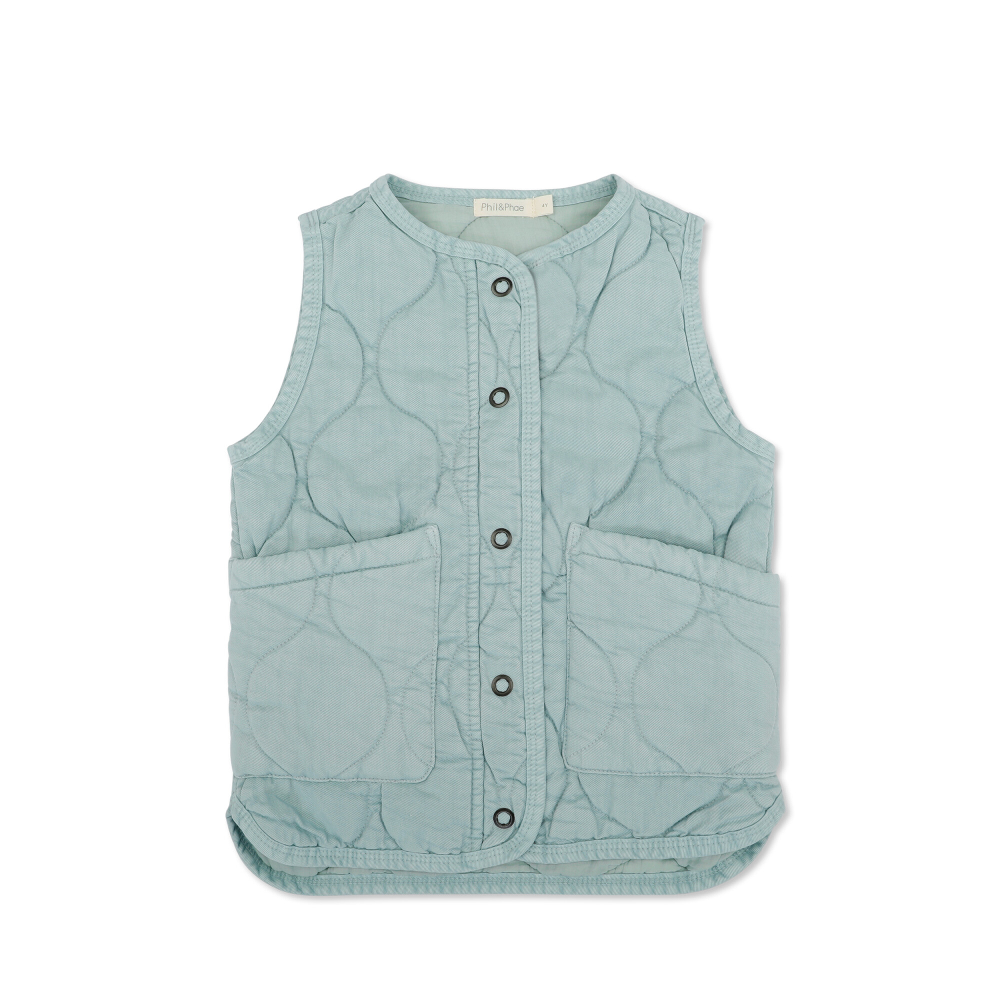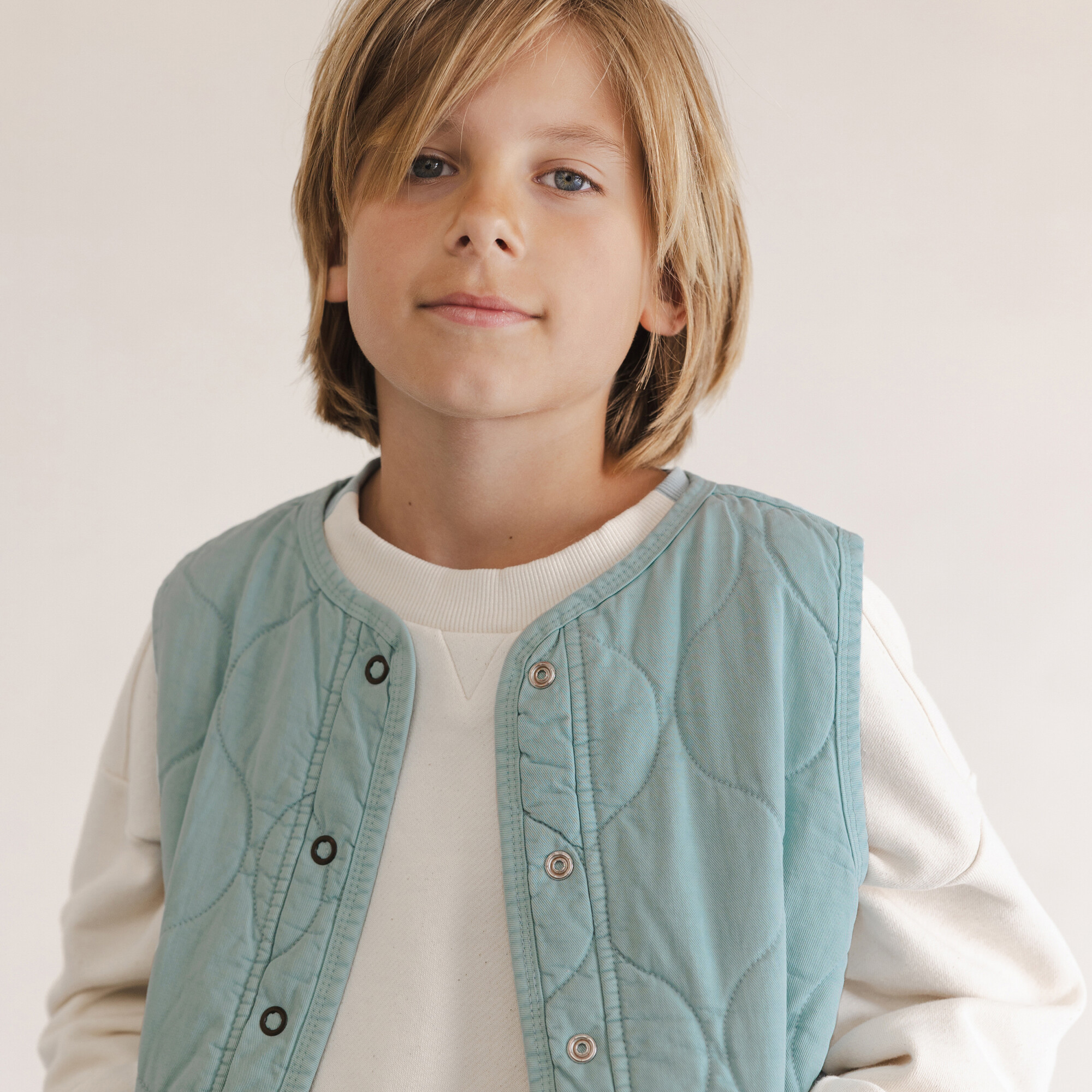 Soft quilted vest made with a cotton/lyocell twill outer, lined width organic cotton. Closes with snaps and features pockets at front.